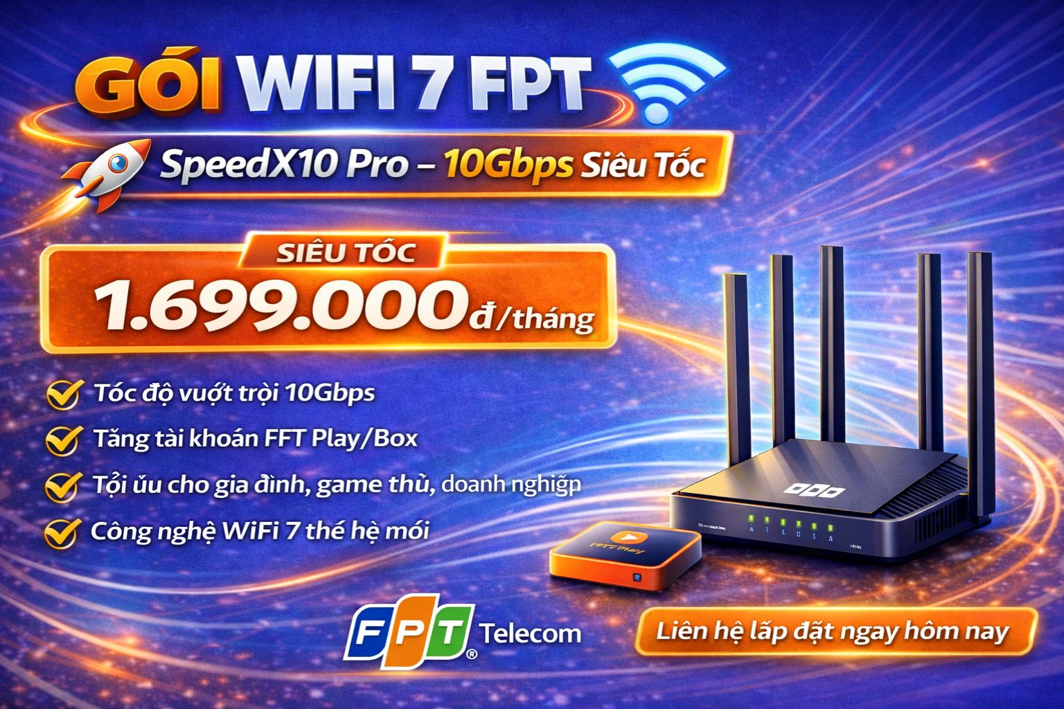 SpeedX10 pro FPT là gói cước wifi 7 và truyền hình FPT Play của FPT Telecom vừa mới ra mắt tháng 11/2025 chạy trên hạ tầng cáp quang XGS-PON băng thông 10Gbps – 10000Mbps đối xứng, chịu tải lên đến 4 lần so với wifi cũ, độ phủ sóng toàn diện và ổn định hơn. Tặng đầu thu giọng nói FPT Play Box 650 kênh truyền hình đa dạng, kho giải trí & thể thao, bóng đá…
