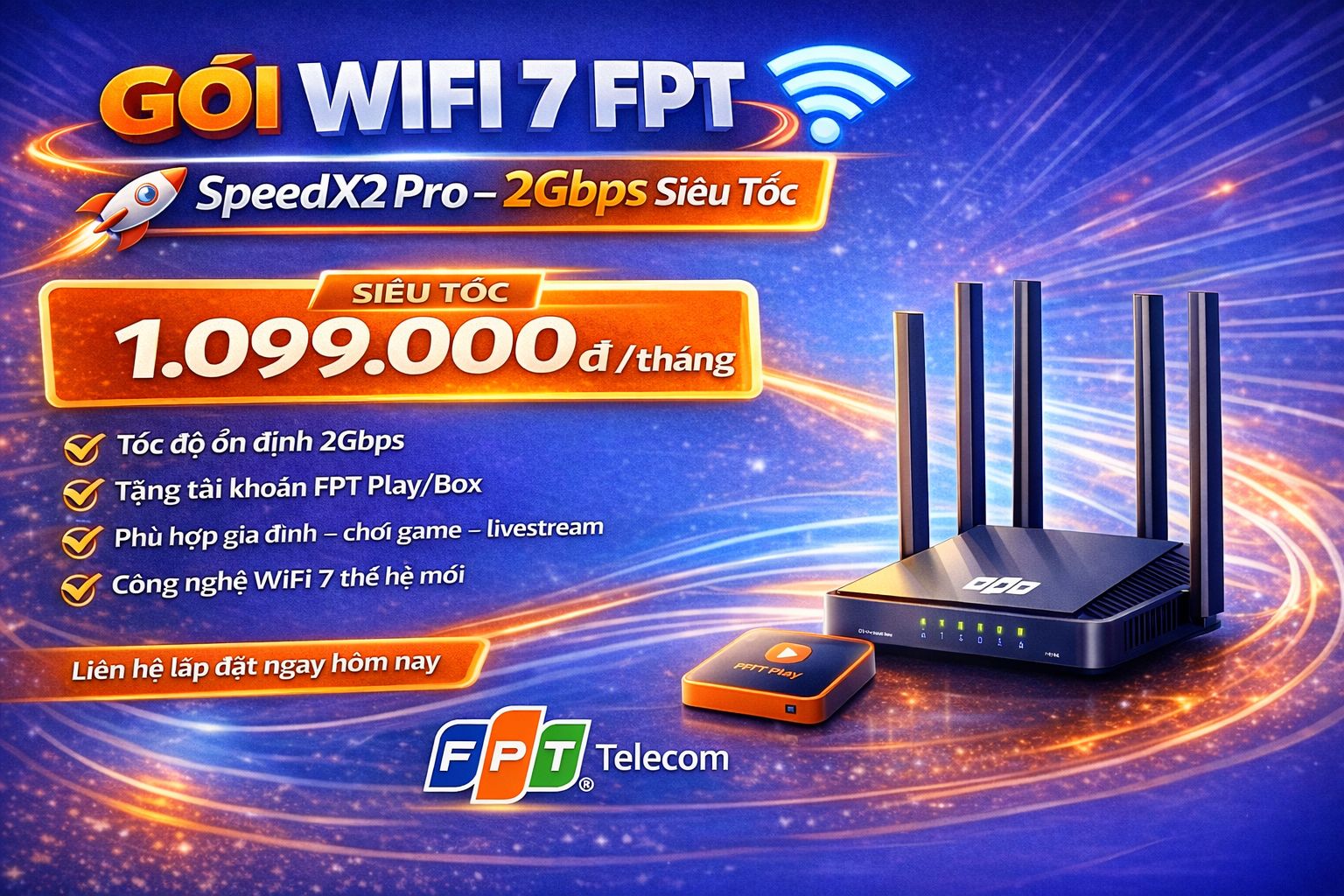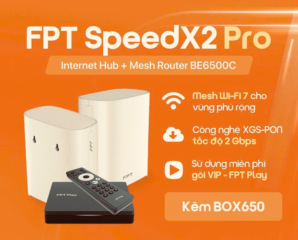 SpeedX2 pro FPT là gói cước wifi 7 + truyền hình FPT Play của FPT Telecom vừa mới ra mắt tháng 11/2025 chạy trên hạ tầng cáp quang XGS-PON băng thông 2Gbps – 2000Mbps đối xứng, chịu tải gấp 4 lần, phủ sóng rộng, tặng kèm box650 FPT Play.